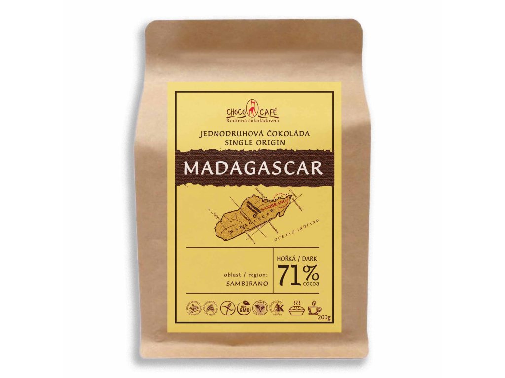 Exkluzivní hořká čokoláda kategorie Single Origin z kakaových bobů z Madagaskaru, region Sambirano (severovýchodní část ostrova ležící blízko rovníku).