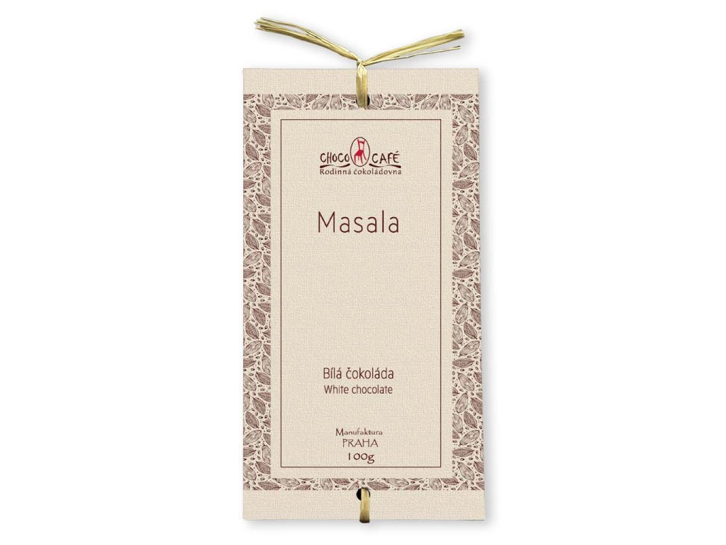 Ručně vyráběná bílá čokoládová tabulka s masalou. S extra vysokým podílem čistého kakaového másla.