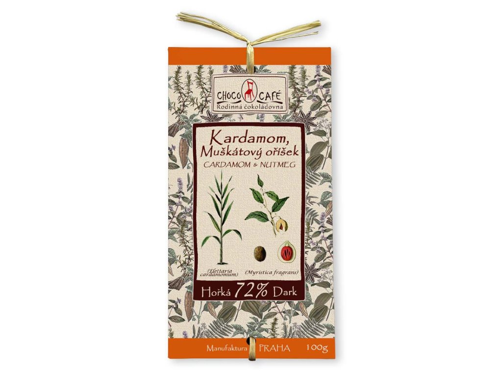 Exkluzivní ručně vyráběná tabulka ze 72% hořké čokolády. Jemně mletý exotický kardamom a muškátový oříšek jsou během výroby ručně zapracovány přímo do čokoládové hmoty. Chuť koření si tak vychutnáte rovnoměrně v každém kousku.
