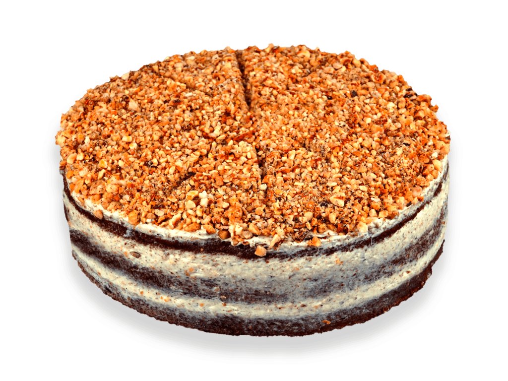 Lehoučký čokoládový piškot plněný vanilkovým šlehačkovým krémem, do kterého jsme zamíchali směs čerstvě pražených ořechů, kterými jsme dort i hustě posypali. Oříšky prostě v každém soustu.