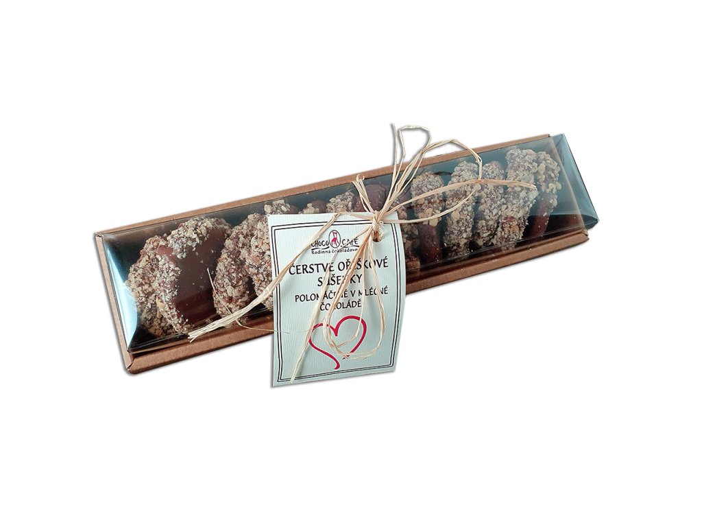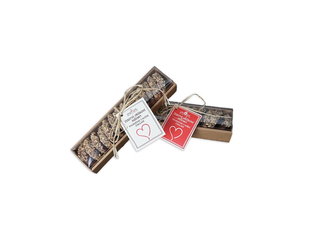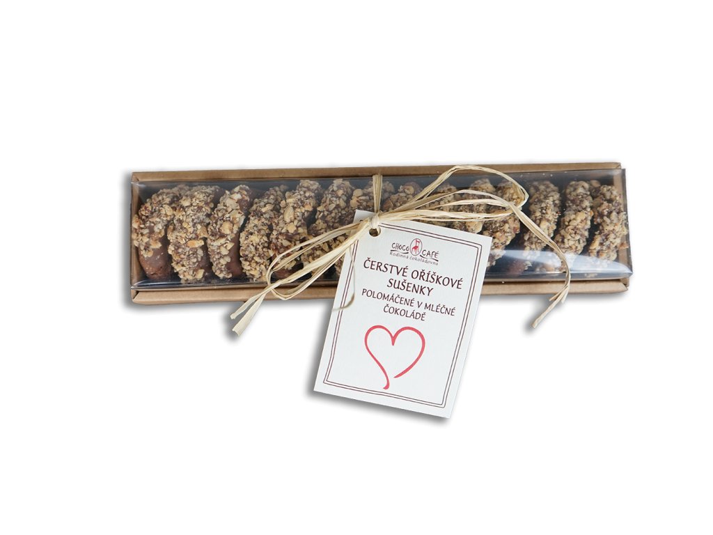 Křehké, čerstvě upečené máslové sušenky s ořechy, namáčené v naší prémiové hořké 72%, nebo mléčné 44% čokoládě.